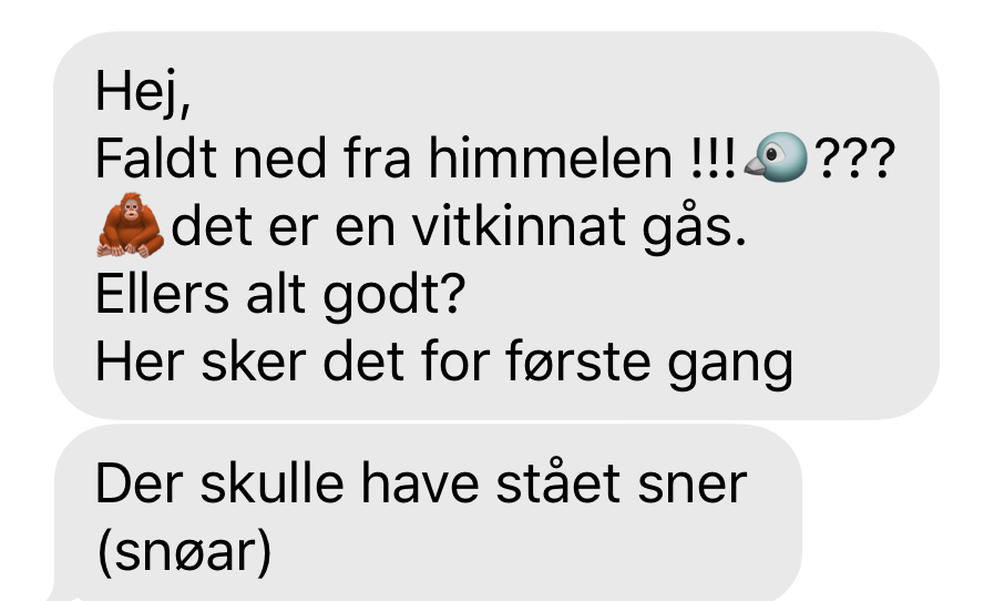 Tak Axel, så hun havde ret igen! Ellers er alt godt. Her begyndte sneen at falde i morges. Men nu væk.