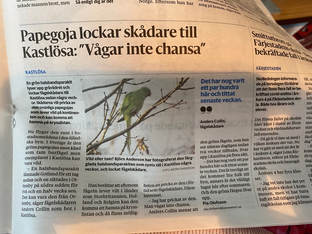 Men jag fastnade för något mycket roligare i dagens Barran. Älskar papegojor, och nu bor i alla fall en på Öland, typ mittemot oss. Och den är förmodligen vild, alltså ingen förrymd tamfågel. Så häftigt!!! Hoppas hen passerar oss och ser vårt alltid påfyllda fågelmats-träd. Och bosätter sig på Udden. Hackspetten behöver en jämnstor kompis.