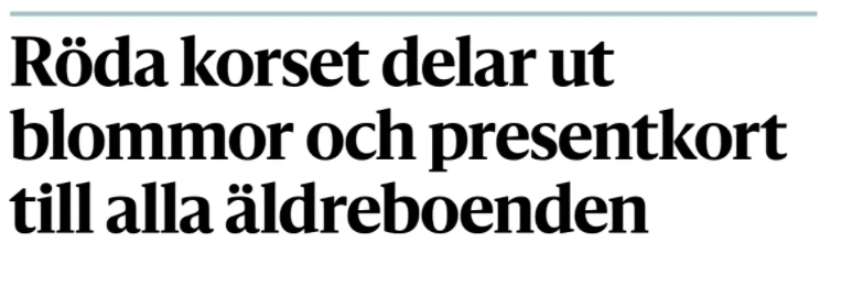 Han: Pandemin har satt stopp för hemmahos-underhållning och kaffe med dopp, men än finns det snälla människor. Rubriken i lokaltidningen lyder alltså: ”Röda Korset delar ut blommor och presentkort till alla äldreboenden”.