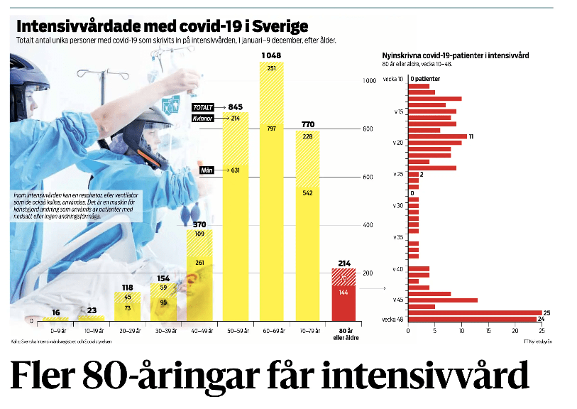 Jämför vi ovanstående diagram med SCB:s befolkningsstatistik visar det sig att det på decimalen är nästan dubbelt så stor risk att du hamnar på intensiven om du mellan 50 och 69 år (0,08%) än 70+ (0,004%).