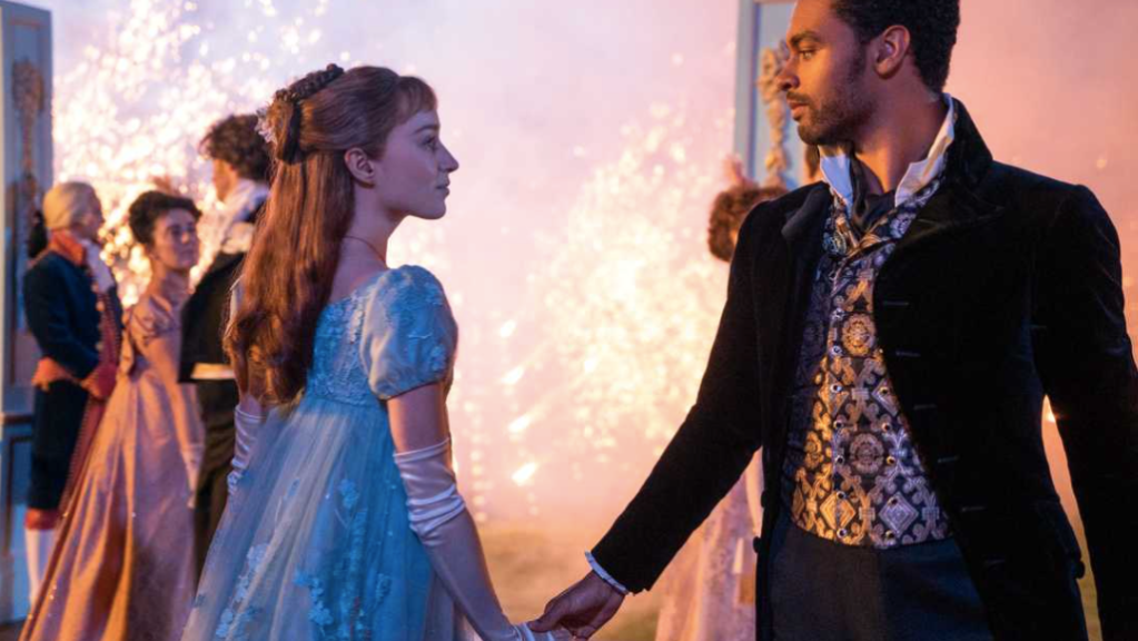Han: Grått och vått. Sydlig vind, 21 m/s i byarna som får 4 grader varmt att kännas som minus 2, enligt SMHI. En dag som gjord för sängen och alla avsnitt av första säsongen av Familjen Bridgerton på Netflix. En mix av Jane Austen med sex i herrgårdstrappor (om du får ihop det), lite Bridget Jones och en massa Gossip girl, om vi ska tro recensenterna.