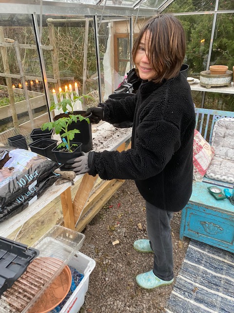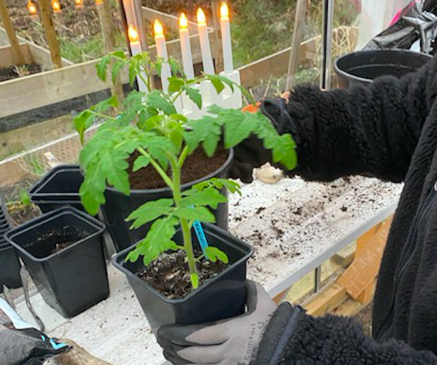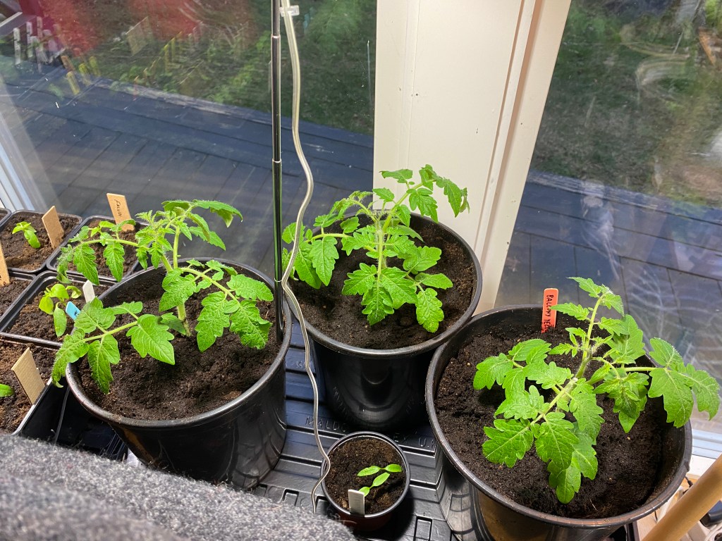 Hon: nja, det där är inte sommarens tomater utan vårens små busktomater som jag hoppas kunna skörda från inomhus, innan de ”riktiga” kommer. Men himla kul att de blivit så stora, bara väntar på att de första blommorna ska visa sig också, jag tror de är på väg…