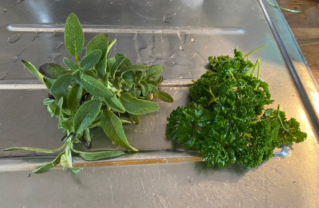 Hon: äntligen tog jag mig i kragen och fick lite gjort, trots vädret… tog t.o.m cykeln och hämtade tidningen imorse trots att det regnade småspik och blåste hårt. Plockade med mig lite persilja och salvia till kvällens middag på vägen in. Han sov på soffan, efter att ha kollat CNN halva natten plus gått upp kl 6.00 och jobbat ett par timmar. Frukost först 10.30. Låter ju inte bra med tanke på rubriken, men det tog sig…
