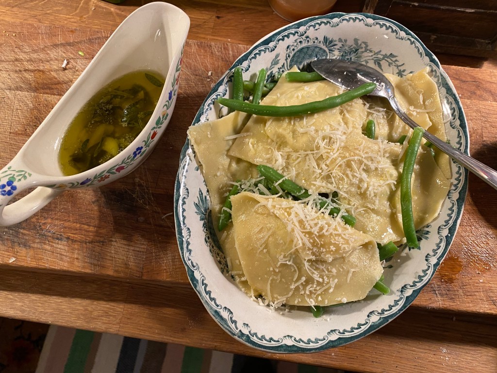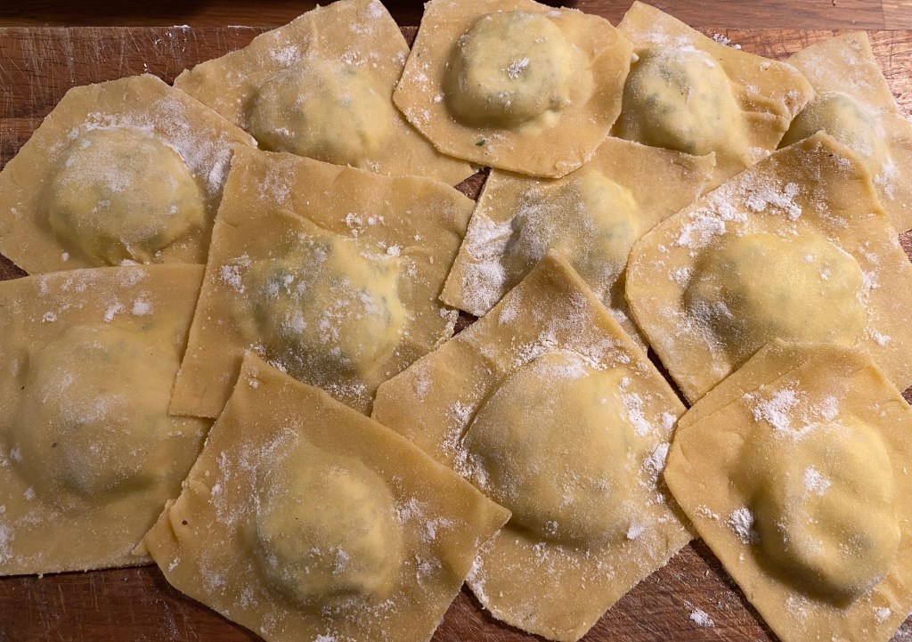 Och så var det dags för raviolin, gjord med nya pastamaskinen förstås. Blev mycket tunnare än med kaveln, men tålamodet tröt och de blev fyrkantiga och stora. Inte små och runda som jag brukar. Men jag blottar mig och visar dem ändå…