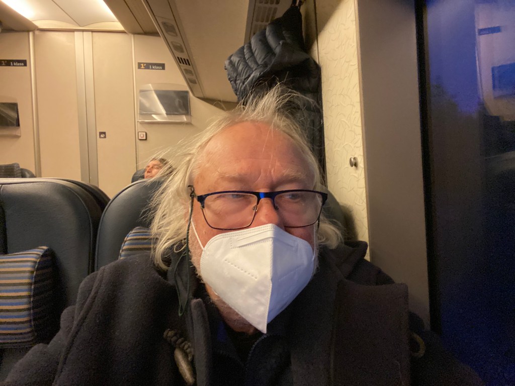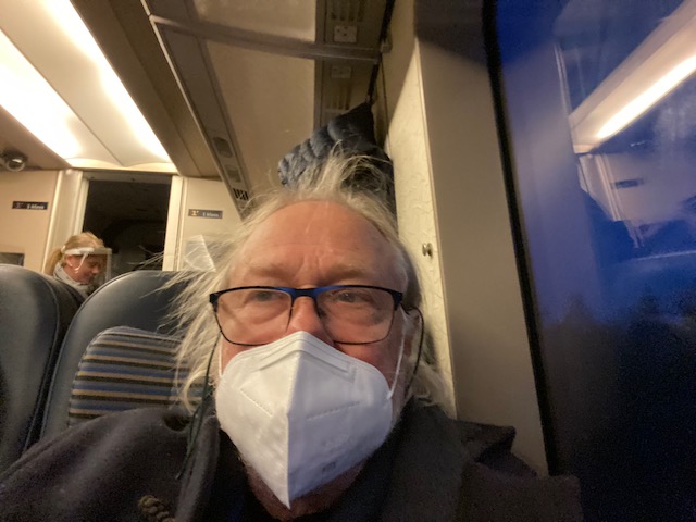 Vaknade av att Peppe kom in och sa hej då kvart i sex imorse. Han ska upp till Stockholm på kontroll av fläcken i ögat på St Eriks sjukhus. (Det gick bra, hurra!) Fick kallelsen först i fredags så det blev ingen gemensam tur upp denna gången. Han åker hem igen vid fyra. Och lika bra vänta till i alla fall han är vaccinerad med längre stadsbesök. Glad blev jag i alla fall när jag fick en bild från honom med med munskydd på!!