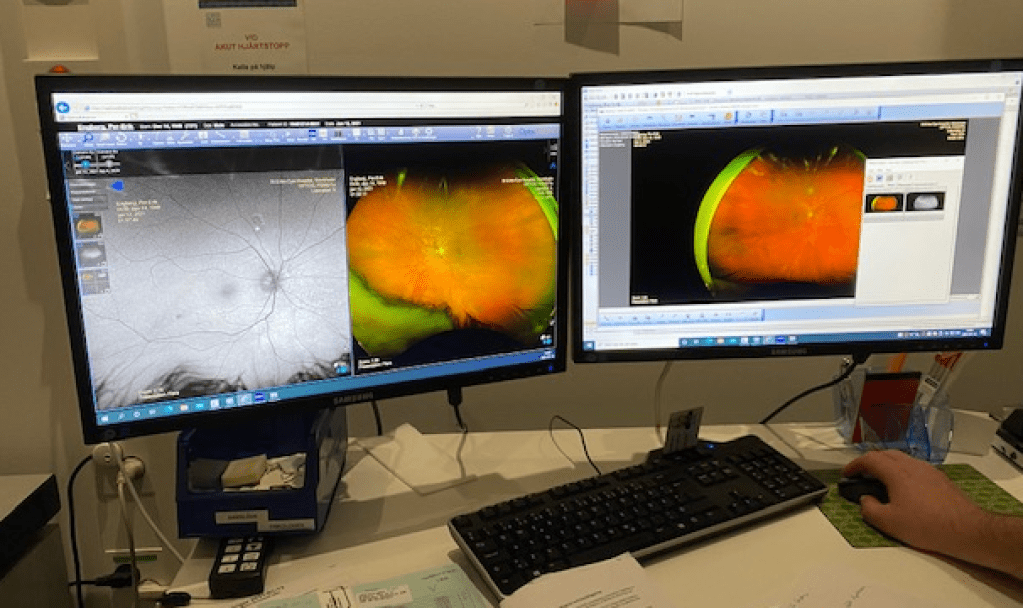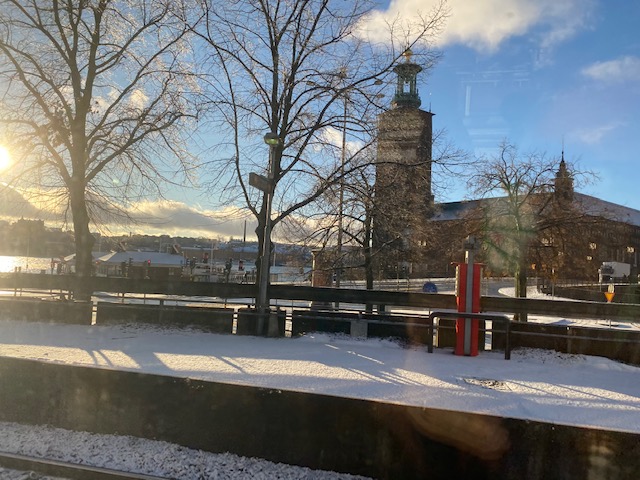 Han: Och medan hon harvat på i arbetslägret har jag surfat omkring på en räkmacka. Eller snarare på Öresundstågs och SJ:s bredband, ätit min 1:a klassfrukost i min sköna stol, bytt tåg, sovit och vaknat i en solig huvudstad, tagit en taxi till S:t Eriks Ögonsjukhus, väntat, ätit en god yakiniki på Indochine, träffat Doktor Mattias som kollade alla mina ögon.