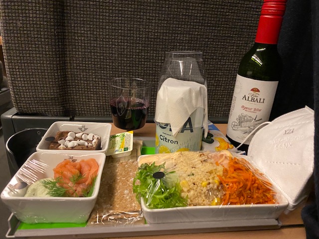 Nu är jag tillbaka i Vagn 1. En snäll människa har frågat när jag vill bli serverad kvällens middag och vad jag vill dricka till.