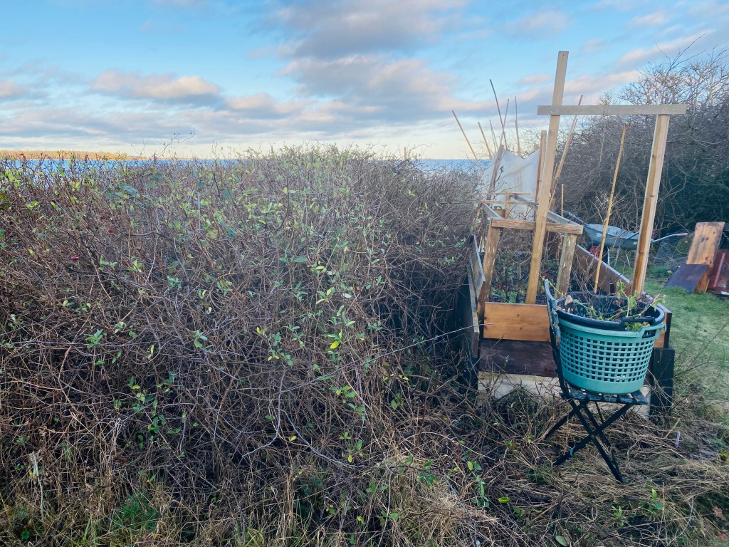 För härligt för att gå in. Började klippa en gång i buskaget bakom chililandet. Vilken härva av hagtorn, björnbärssnår och kaprifol. Pust! Pallade en timme, kom en halvmeter in typ..,