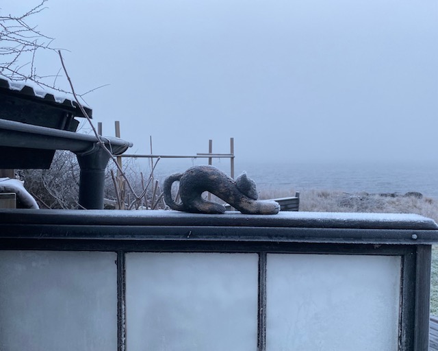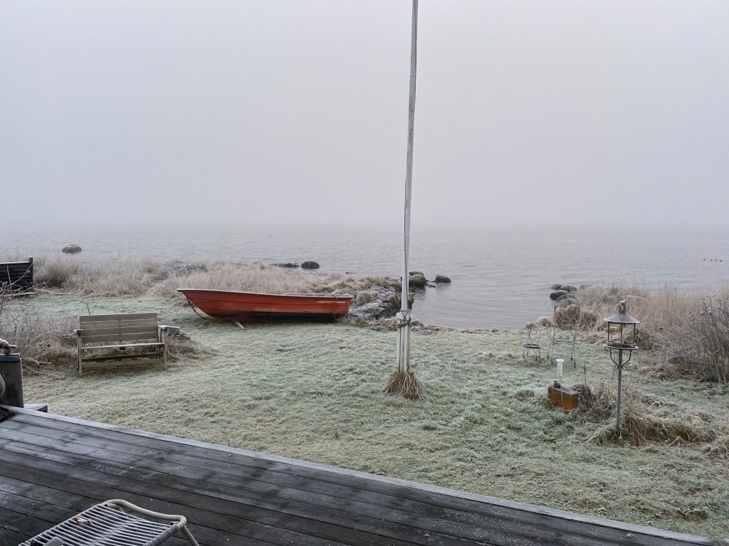 Hon: och om det var blå blå himlar igår, är det grå grå himlar och hav idag. Och dimma. Man såg inte Fimpan alls imorse.
