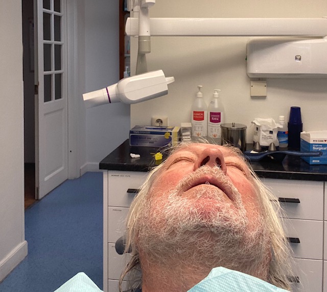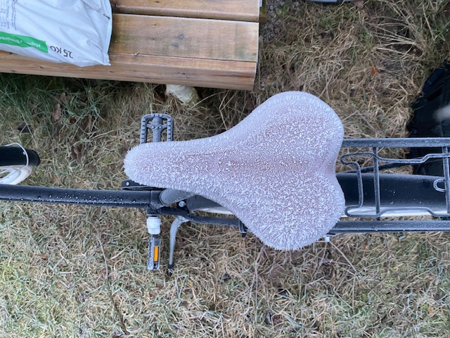 Han: 06:26. Vakande innan jag somnade, kändes det som. Frost. Vackert. Efter morgonens arbete bakom tangentbordet (06:30-08:24) och kort frukost (08:24-08:43) hade vi båda tid (09:10) hos Torsås nya tandläkarpar, Deborah Malec och Michel Hanna.