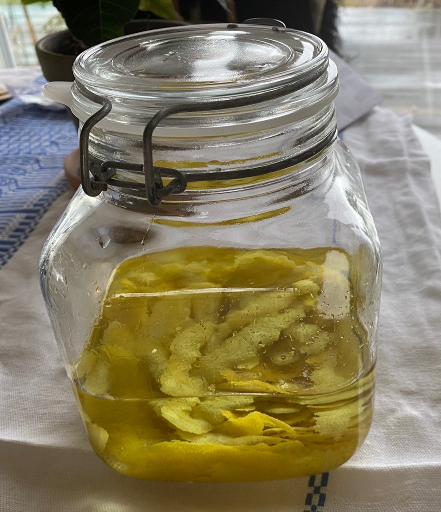 Tänkte göra ”riktig” limoncello på dem, inte fuskvarianten jag gjort hittills. Den innehåller saften och tar knappt en vecka. Nu blir det bara skal och sprit först i en dryg månad, sedan i med sockerlag och så får det dra ytterligare minst en månad. Ingen saft ska i alls. Ska bli spännande att smaka skillnaden. Sist blev fuskvarianten lite besk tyckte jag. Det är så tråkigt att skala citronerna så förmodligen slarvade jag och lät för mycket av det vita komma med. Hoppas jag var tillräckligt noggrann idag…