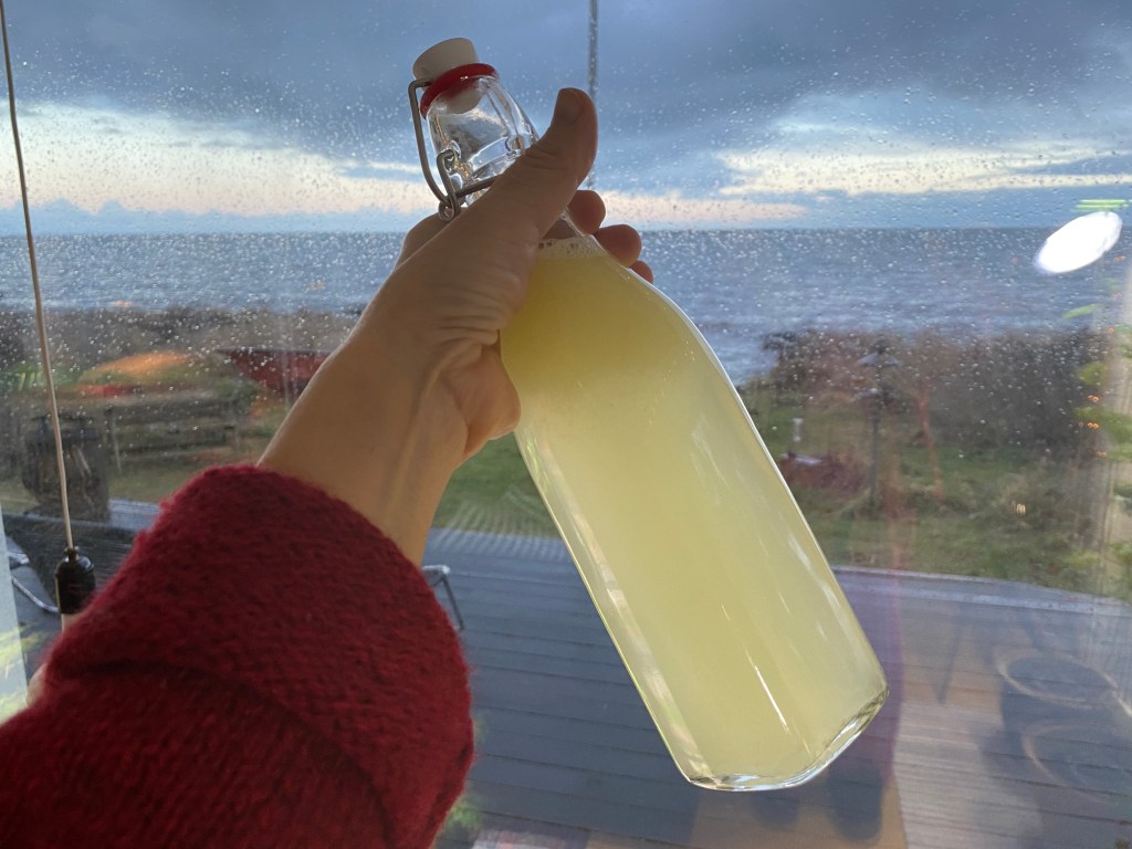 Och vad gör man med 15 skalade citroner… kanske citron- och ingefärslemonad. Japp! Blev tre flaskor. Och god blev den, tyckte jag i alla fall 🙂