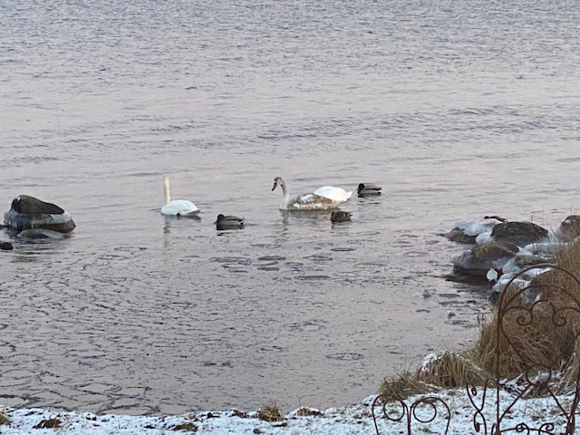 Han: Och inte bara små fåglar. I viken ligger ett av våra övervintrande svanpar. De födde 4 ungar i våras, en klarade sig undan havsörnarna och gäddorna som inte bara leker i vikar och vass. Och detta ensambarn bor fortfarande hemma trots att hen nu är lika stor som sina föräldrar.
