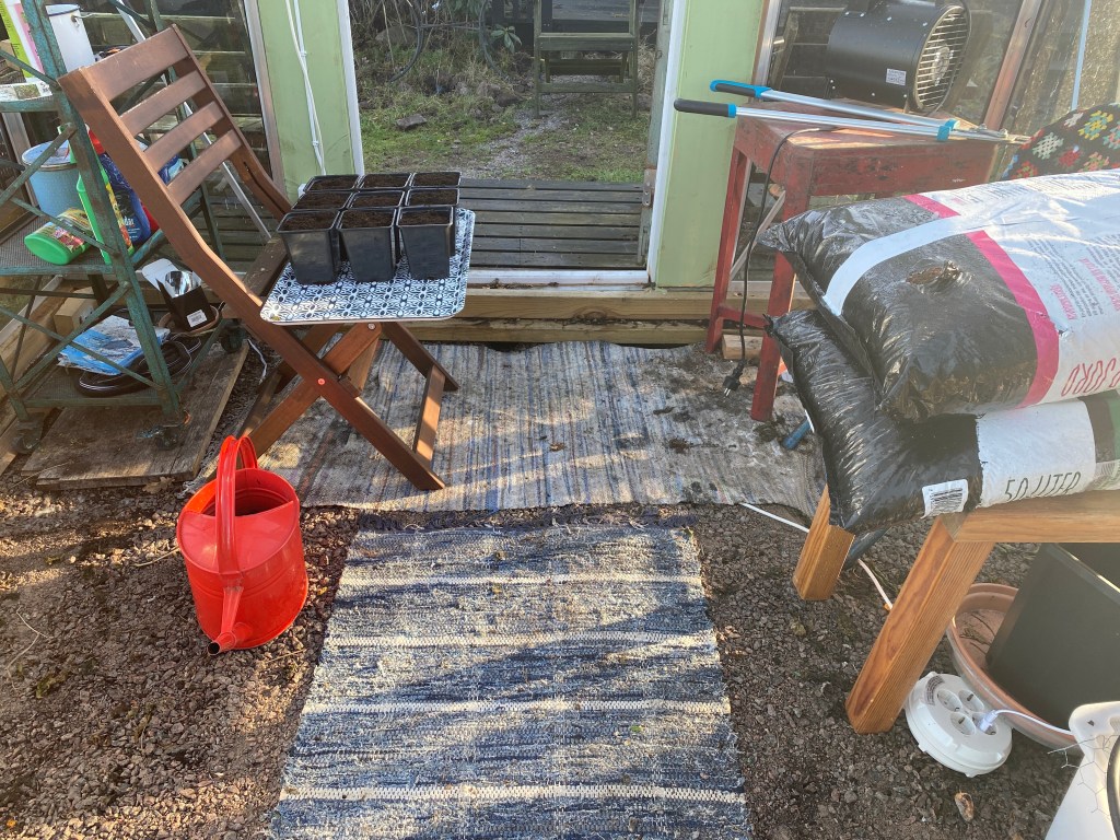 Men man får inte ge upp. Satte om en del av de små nyuppkomna chilisarna idag. Vågade inte ta ut dom i växthuset även om det verkligen kändes som vår därute. Fyllde krukorna med jord och tog in dem i värmen.