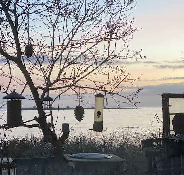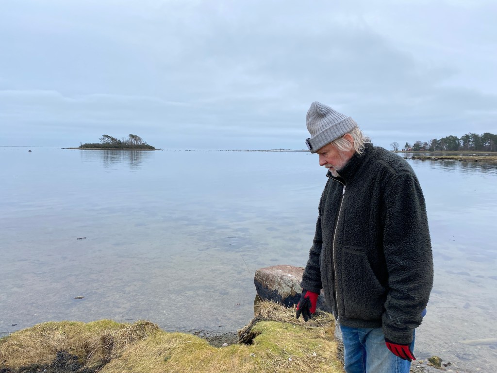Han: Och där bakom henne anar man några av 23 svanar som just nu och här håller till i den här viken, som jag inte vet vad den heter, men hon står på en liten ö som heter Lamnekroken. I vår vik, Skäppeviken, såg räknade jag till ytterligare 27 svanar.
