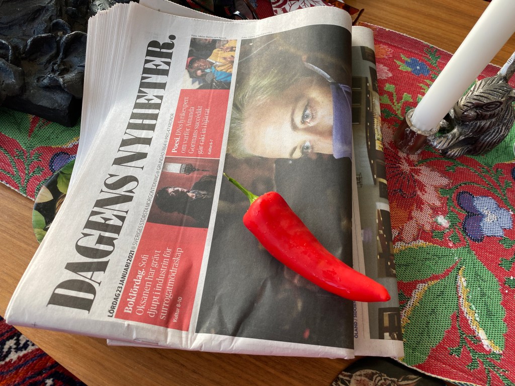 Hon: plockade ut en chili ur frysen till frukost-mackan, tänk att den är lika fin som om jag nyss plockat den från plantan. Den här är för övrigt en tidig sort, och jag har en planta på gång, så snart blir det färsk på riktigt. Eller typ snart…