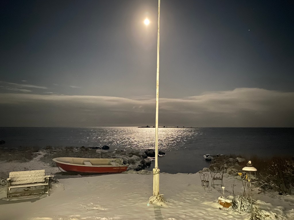 19.20. Lämnar dumburken och tittar ut, och vilken tur jag gjorde det… Sååå vacker kväll, en massa snö och så fullmåne på det som lyser upp hela landskapet. Magiskt!