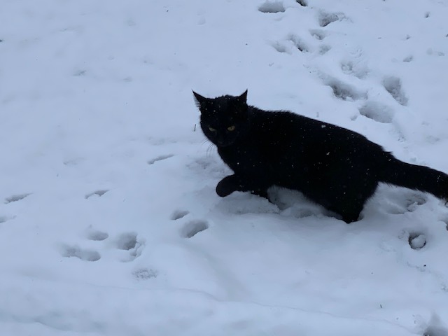 Han: Det tassar omkring både varg och lodjur i vår landsända. Förhoppningsvis inte i vår absoluta närhet hoppas vi. Däremot räv och kaninspår i snön.