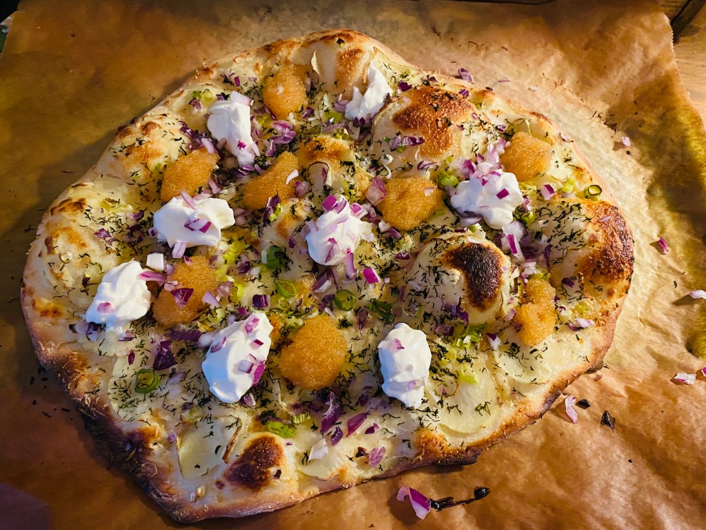 Googlade runt efter inspiration för middagsmat, utifrån vad som finns i ”ladorna”. Fastnade för Pizza Bianco med löjrom, ja hittade äntligen löjrom när vi var på Blomlöfs och handlade torsk häromdagen. Till nyår hittade jag ingen, men bättre sent än aldrig.