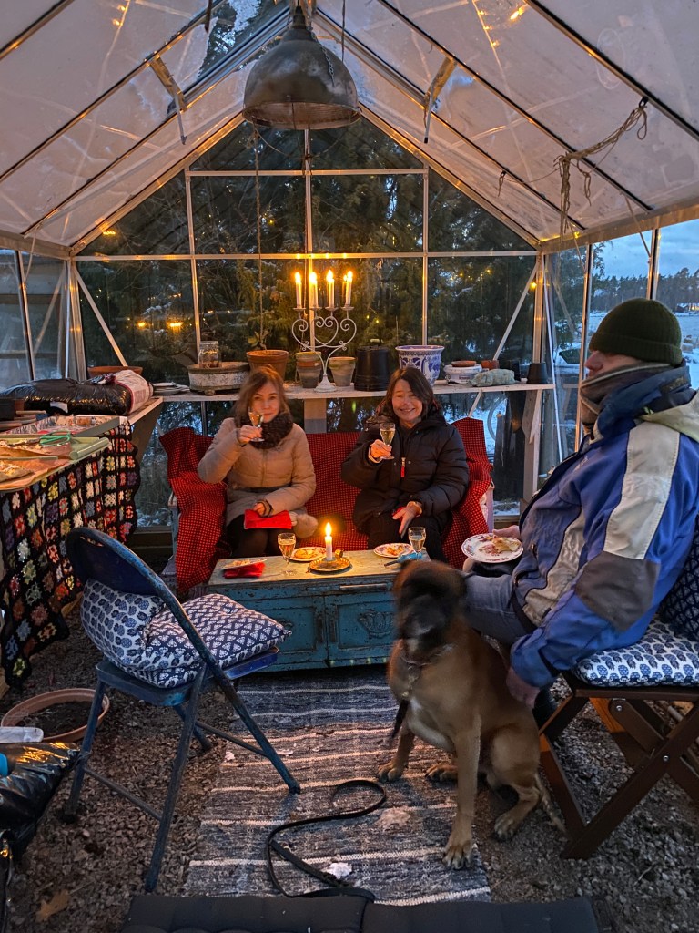 Kom på att de ju vore kul om Ancy och Håkan kom på fredags-drink, eftersom de inte heller fick någon löjrom på nyår. Tanken var bubbel och Pizza vid femsnåret någonstans ute i lä med en liten brasa som värmekälla. Dessvärre fanns det ingen lä någonstans så vi omlokaliserade drinken till växthus 1. Typ som ute, men utan vind. Himla trevligt blev det, och på alla bilderna lyckades någon blunda…