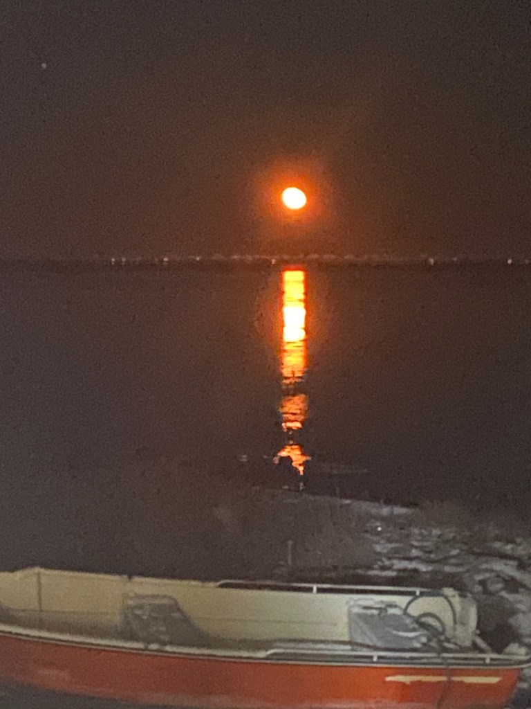 Hon: sms från Ancy (vän och granne): ”kolla in månen! Galet 😀”. Och ja, aldrig sett en så orange fin och stor måne. Men varför går det inte få till på bild…