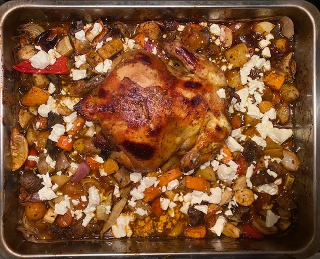 Konstaterar en färglös gubbe på en udde som nyss fick i uppdrag att titta till kvällens middag – en vackert gyllenbrun kyckling på en bädd av röda och gula rotfrukter och beströdd av vit fetaost.