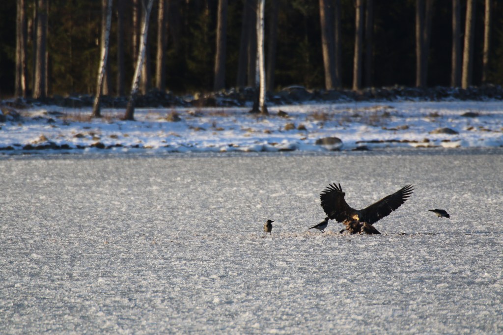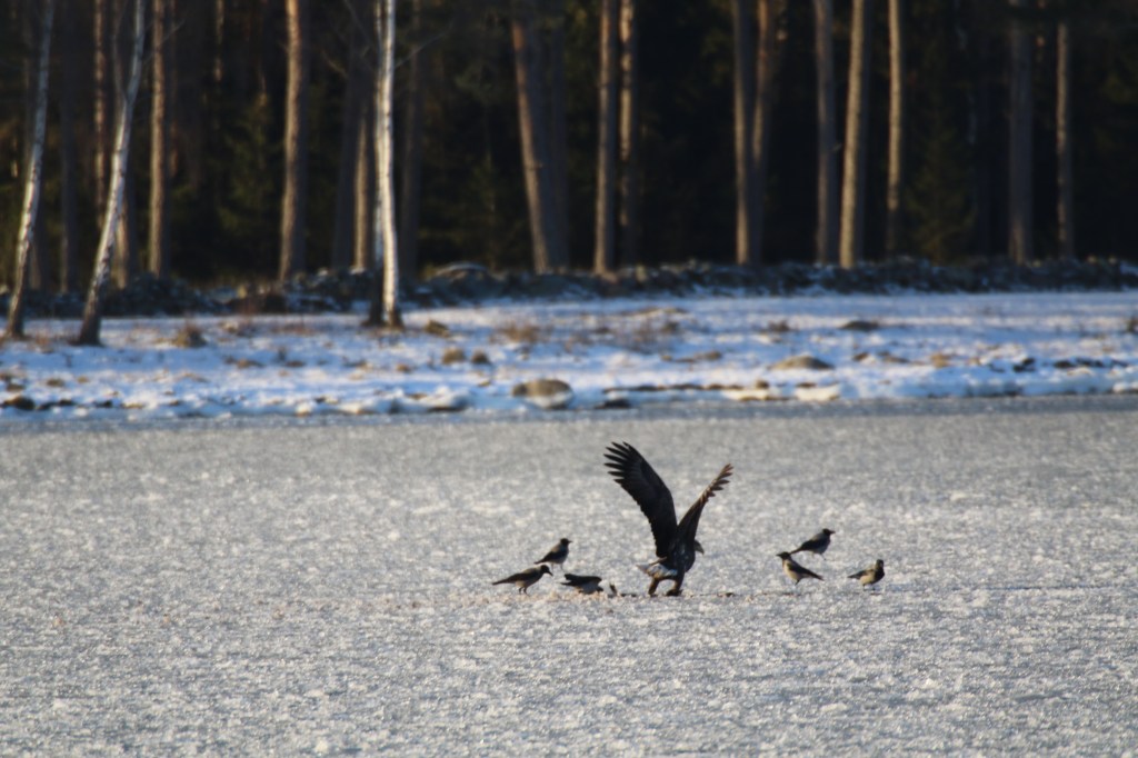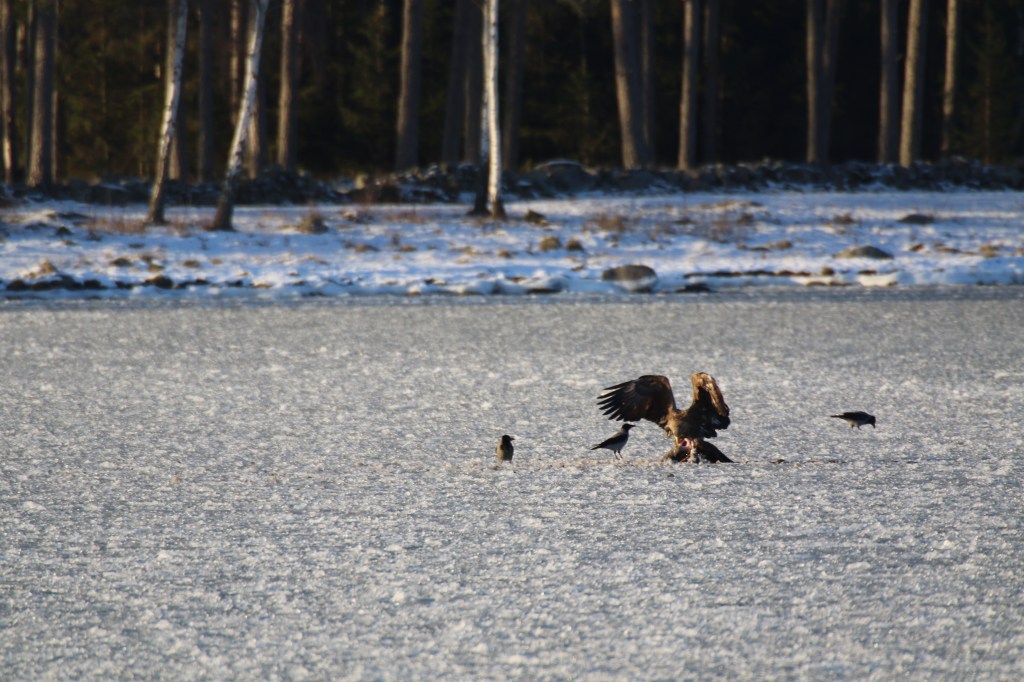 Hon: ja pust, vilken pärs!!! Var helt övertygad om att de tagit Vilda. Det var för övrigt två Havsörnar, med crew, flera kråkor och en trut, som alla väntade på sin tur att få kalasa. Är ju egentligen fantastiskt att kunna beskåda detta på så nära håll, men när man tror det är en älskad familjemedlem de kalasar på känner man ju bara hat och avsky. Husse fick sig en drapa också när han kom dragande med sin nya kamera. Likställde honom med gamarna som stannar och filmar när det hänt en olycka istället för att hjälpa till…