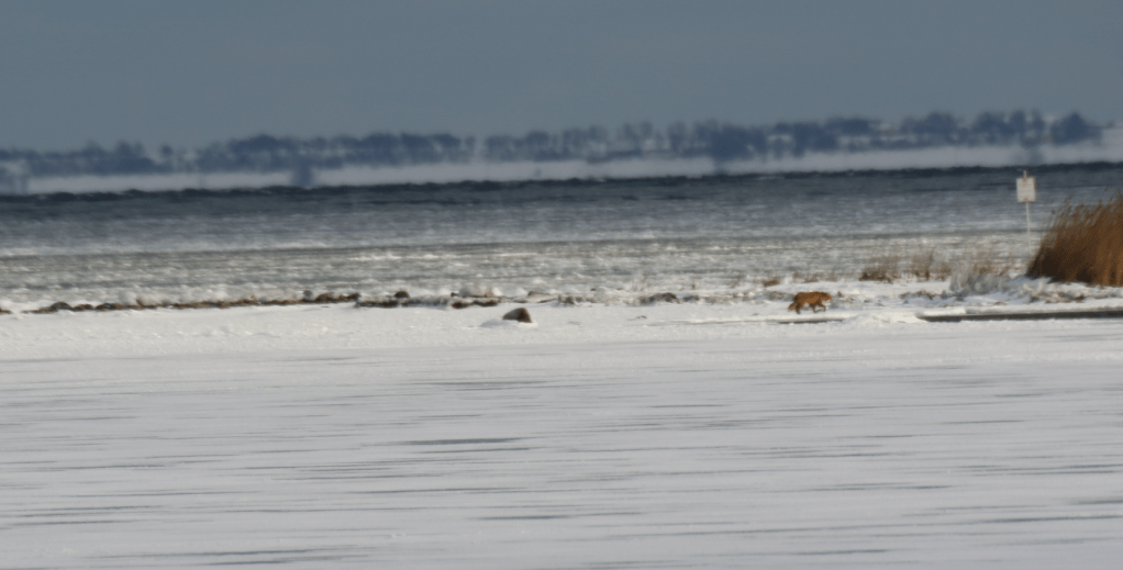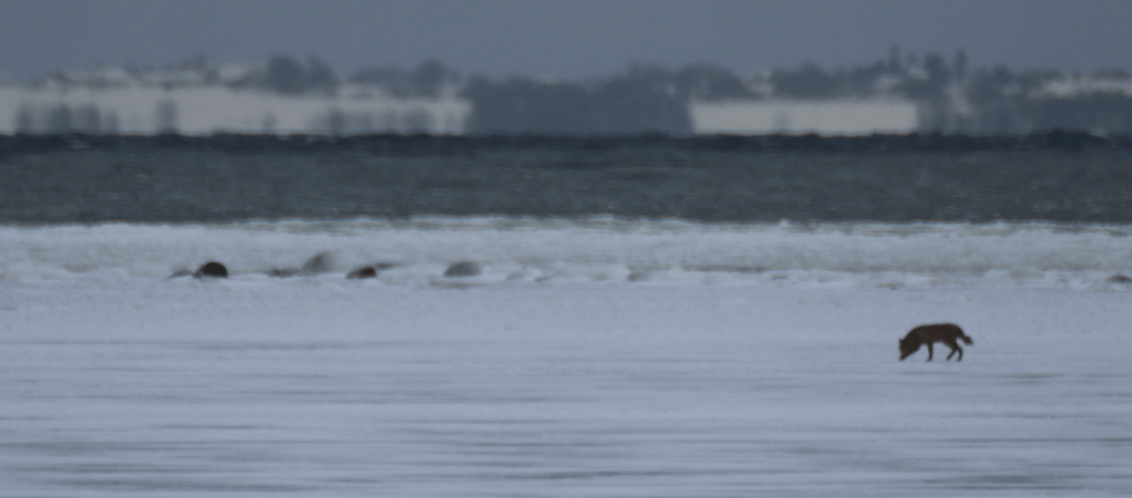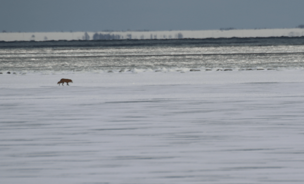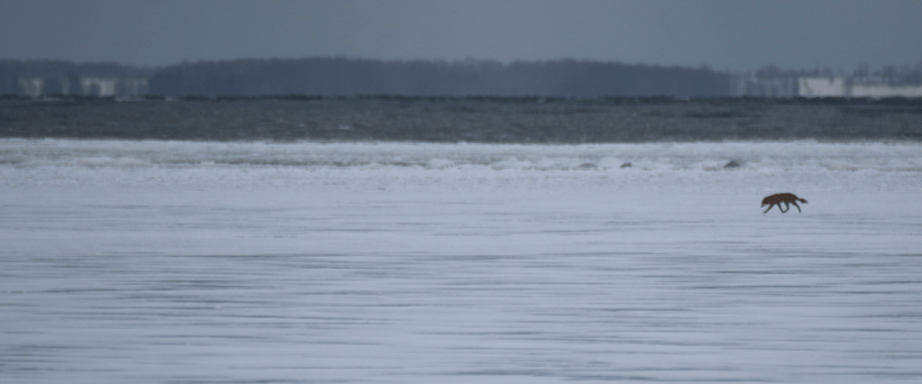 OK, jag ger dig ovanstående bildserie utan förhoppning om att bli prisad. Långsamhet är inte längre en dygd och jag har avpublicerat 32 stillbilder på dagens händelse vid vatten: Hon får syn på att en räv letat sig ut på isen, hen är på väg mot Fimpan.