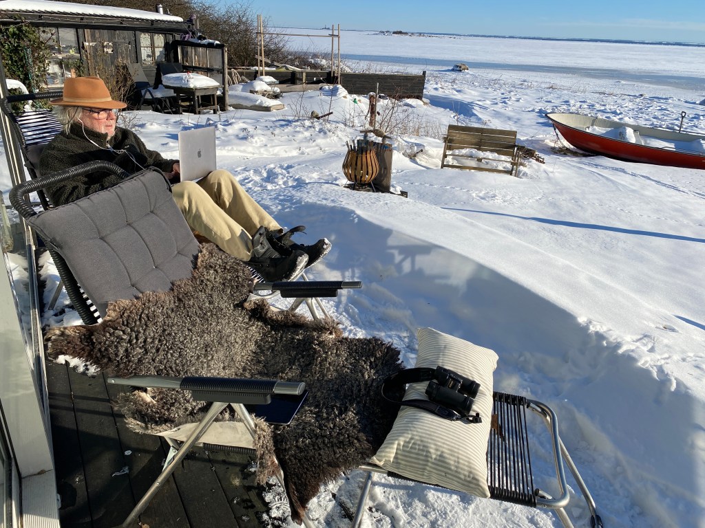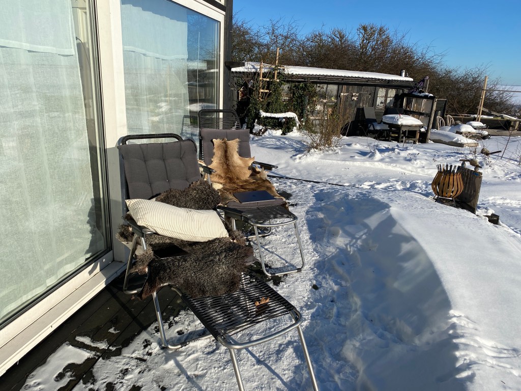 Hon: tänk att man kan börja sitta ute och äta frukost nu. Om vinden är rätt, solen skiner och dunjacka är på förstås. Men solen har verkligen börjat värma på riktigt nu. Inne blev det på tok för varmt, chiliplantorna krävde dessutom fördragna gardiner och utsikten blev begränsad. ”Ska vi inte testa att sitta ute? Jo det gör vi, jag hämtar fällarna!”