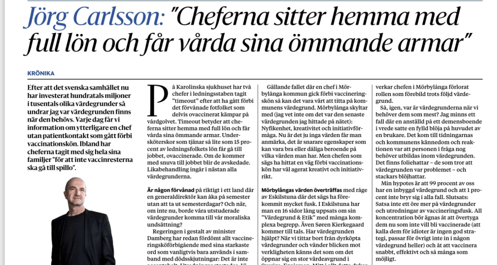 Har värdegrundandet överhuvud gjort någon nytta? Nej, ”när vi tittar bort från dyrköpta värdegrunder och vänder blicken mot verkligheten känns det som om det öppnar sig en stor värdeavgrund i Sverige: Egoismen”, skriver Jörg Carlsson. Min hypotes är att 99 procent av oss har en inbyggd värdegrund och att 1 procent inte bryr sig i alla fall. Slutsats: Satsa inte ett öre mer på värdegrunder och utredningar av vaccineringsfusk. All koncentration bör ägnas åt att övertyga dem nu som inte vill bli vaccinerade (att kalla dem för idioter är ingen god strategi, passar för övrigt inte in i någon värdegrund heller) och åt att vaccinera snabbt, effektivt och så många som möjligt.