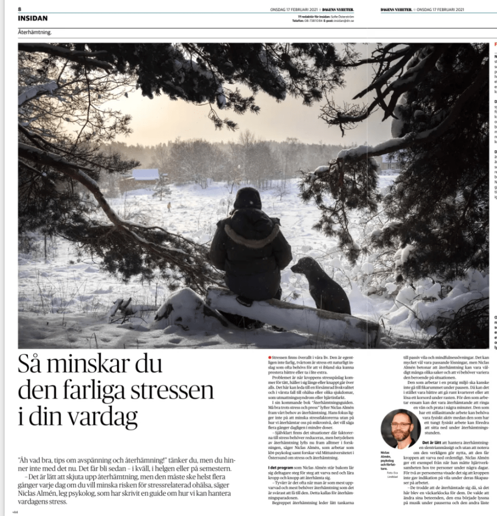 Han: Ibland känner jag mig stressad. Särskilt av alla dessa artiklar om stress. Skojar, men har det inte gått inflation i pratat om att alla är så stressade nu för tiden? Idag läser jag ännu ett uppslag i Dagens Nyheter: ”Så minskar du den farliga stressen i din vardag”.