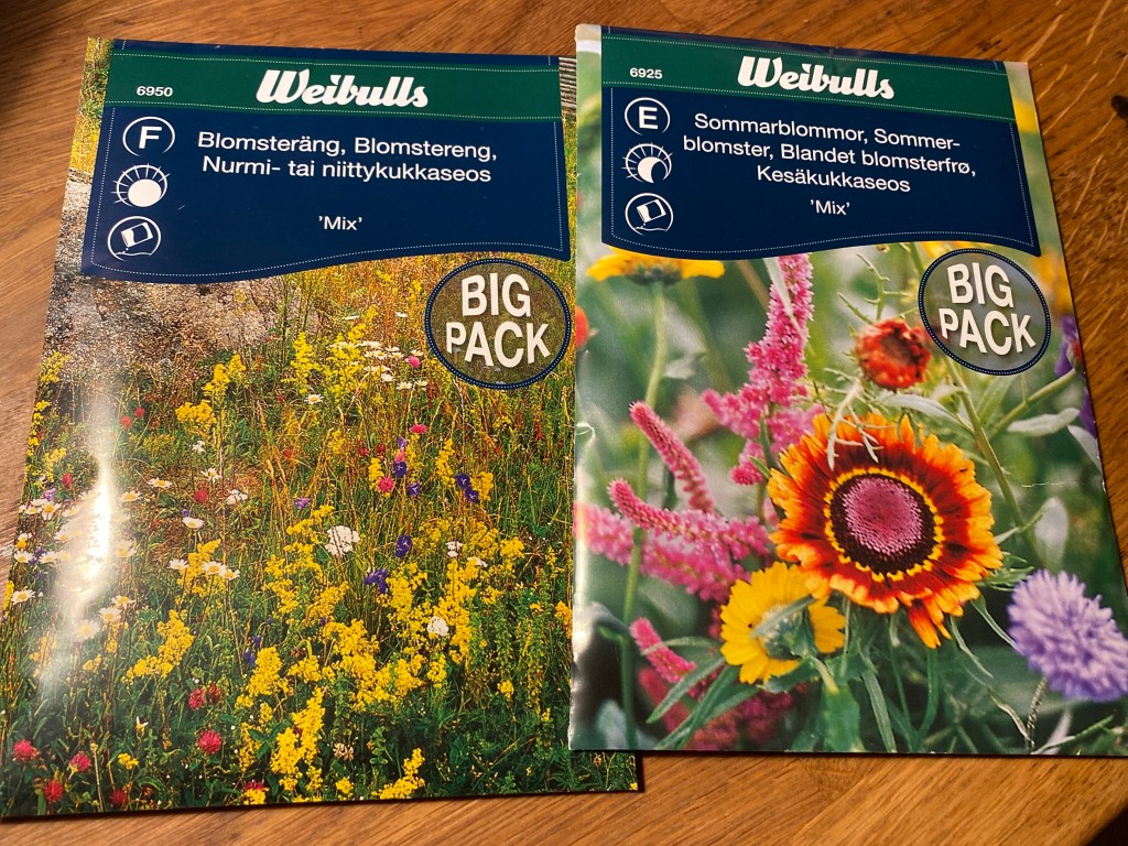 Hon: jag har redan planerat för binas vällevnad härute hos oss. Jag har köpt storpack med blomfröer och strödde faktiskt ut en del redan innan snön kom. De som inte är ettåriga bör klara sig och förhoppningsvis titta upp tidigt. När snön och tjälen släppt ska resten ut. Här blir det inga nagelsax-klippta gräsmattor i år heller, bara blomstrande sommarängar. Hoppas jag…