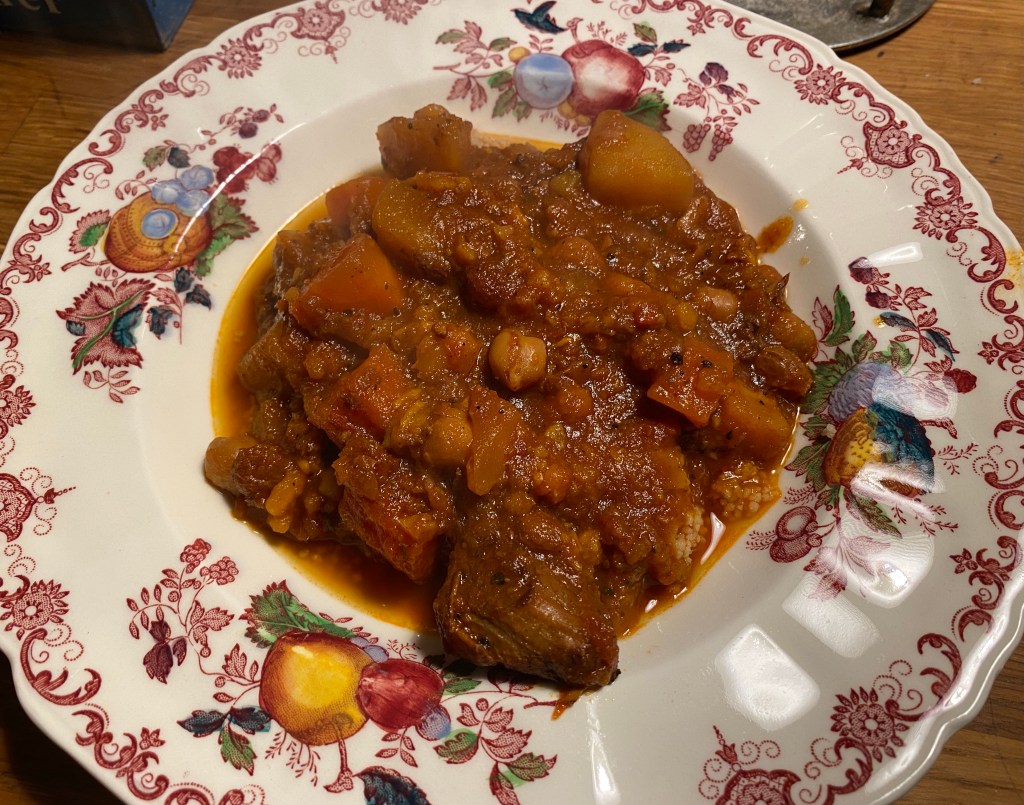 Och så har en Marockansk köttgryta puttrat på spisen hela eftermiddagen. Ville egentligen ha lamm men det är svårt att få tag på här om man inte köper ett helt lamm och får styckat. Attanäs grytbitar från ”närodlade kossor” funkade också finfint. Likaså chilin från Skeppevik. Vinet till kommer från Australien, och det hade jag nog inte köpt om jag vetat, tyckte bara det var roliga etiketter. Men det var faktiskt jättegott. Grytan dög bra också.