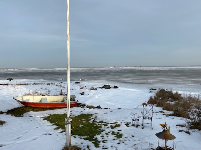 Hon: eller så lyssnar man på havet, som jag gjorde under vanliga rundan runt sjön bort till Järnsida i förmiddags. Där är det nästan helt öppet hav nu. Såg vårt svanpar och deras unge på vägen dit, blev jag glad för. Längtar efter att de ska kunna simma in i vår vik som vanligt igen. Tar nog ett par dagar till innan isen ger sig hela vägen dit, men nästa helg lär det gå, om prognosen stämmer.