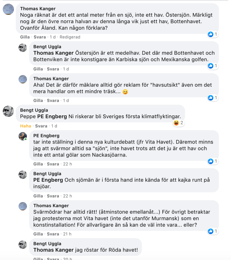 Han fick genast svar från en annan besserwisser: ”Östersjön är ett medelhav. Det där med Bottenhavet och Bottenviken är inte konstigare än Karibiska sjön och Mexikanska golfen.”