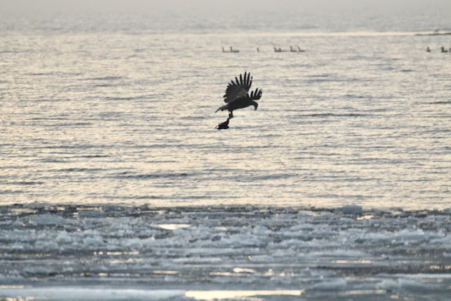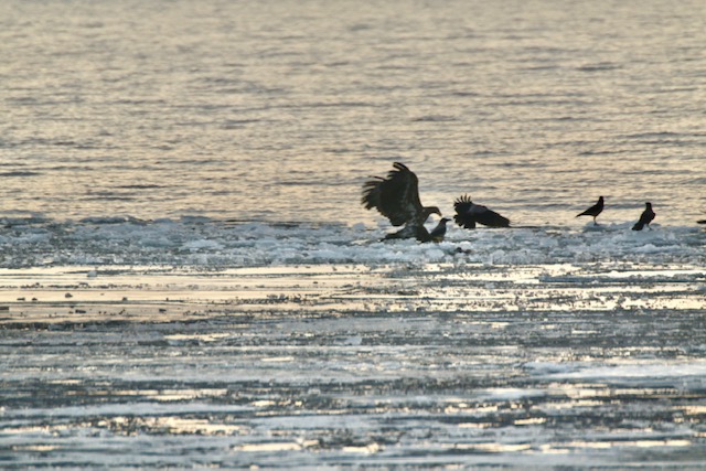 […] Det började med att havsörnan dök upp. Det är säkert vintertecken. Havsörnen är som gamarna, asätare. De väntar på att sjöfåglarna ska frysa fast i isen.– […]