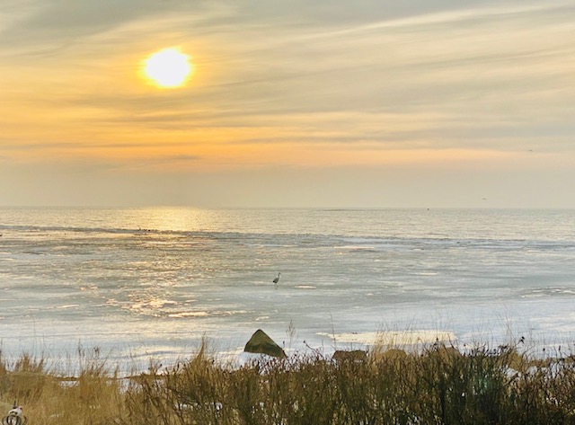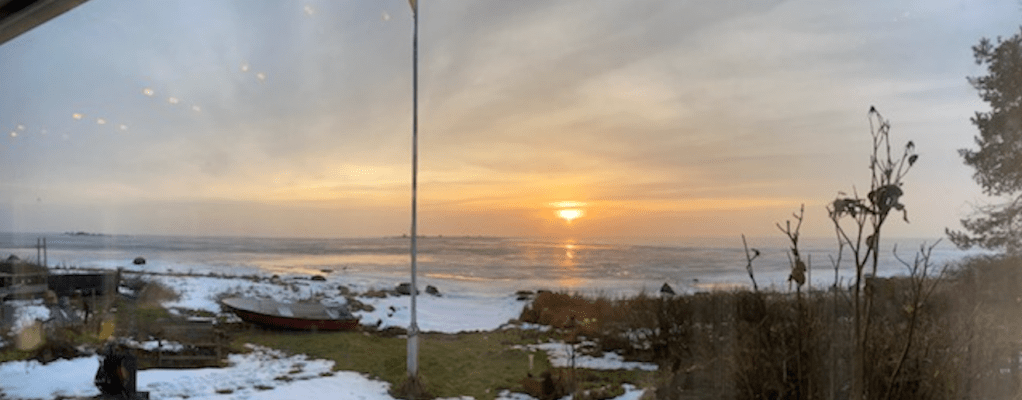Han: Solig morgon över smältande is. Ännu sover katter och kvinna, men se där ännu en luggsliten man tittar ut över sjön. Eller havet. På facebook, där ingen sover och heller ingen är vaken, fortsätter diskussion om sjön är ett hav eller om havet är en sjö: