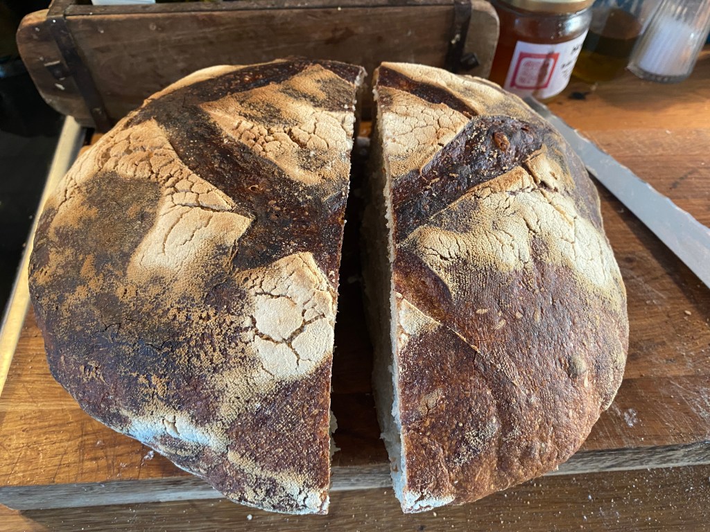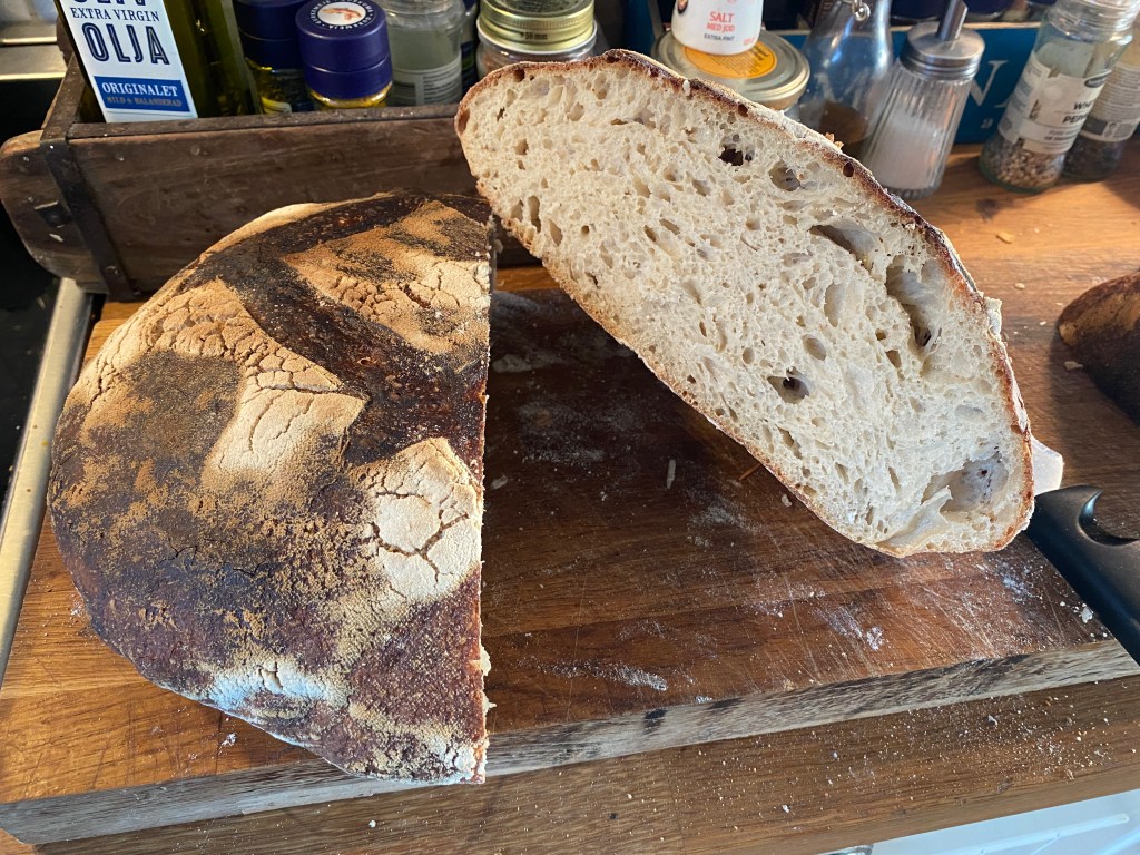 Men dagen började med ett nytt ”på-känn-bröd”, bakat igår kväll. På surdeg, men ljusare än sist. Hörde faktiskt ett ”gott bröd” från honom, utan att jag frågat eller nämnt frågan. Kors i taket, han vill egentligen helst ha köpt färdigskivat rostbröd. Det vågar han inte köpa utan plockar snabbt ner hårt ljust tunnbröd i varukorgen istället…