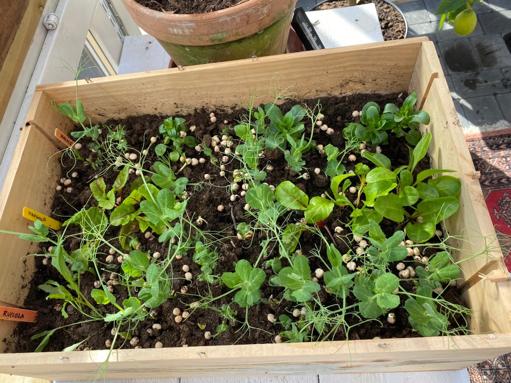 Mina små salladsblad och ärtskott tycker däremot att det redan har blivit tillräckligt varmt i växthuset för att börja leverera. I alla fall lagom mycket till våra frukostmackor. Mums!