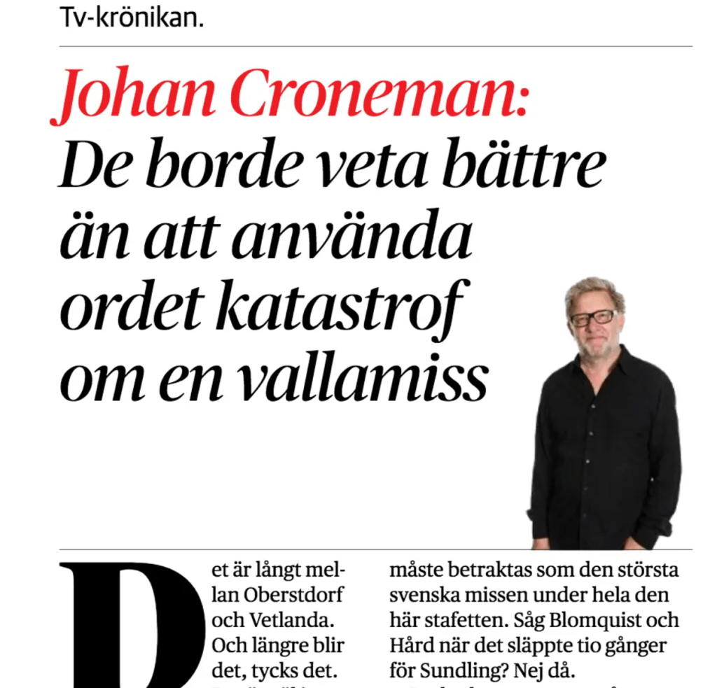 – Det är tack vare journalisterna besvärjelser som prestationerna i åtta fall av tio känns som en katastrof. Eller en tragedi. Efter tjejstafetten vaknade SVT:s Jacob Hård och Anders Blomquist i en ”mardröm”, som om de hade sovit sig genom loppet. I andra sportkanaler användes ord som ”smärtsamt”, ”chockerande”, ”omskakande”, ”sorgligt”.