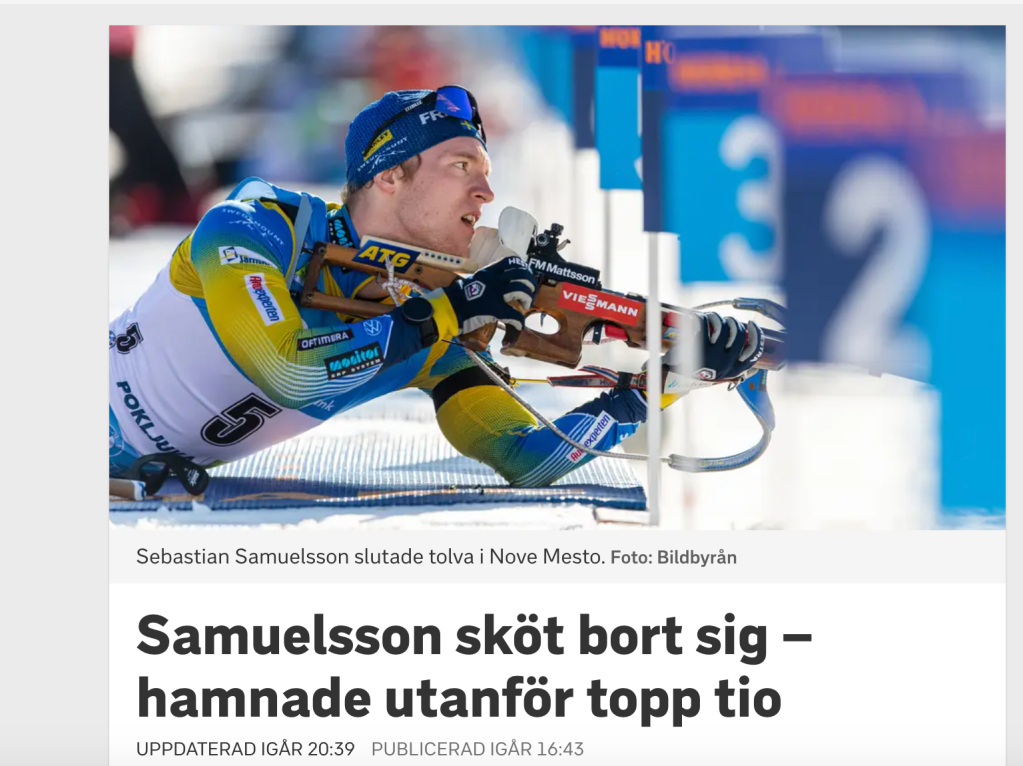 Man kan notera att journalister överdrifter sällan har stöd hos de aktiva. Sebastian Samuelsson lyckades inte följa upp andraplatsen i sprint med en ny pallplats i jaktstarten i Nove Mesto. Han slutade tolva efter att ha skjutit en bom i vardera fyra skjutningar.