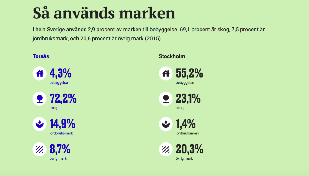 Och här får jag veta att bara 4,3% av marken i vår nya kommun har besudlats med bebyggelse mot mer än hälften (55,2%) i Stockholm.