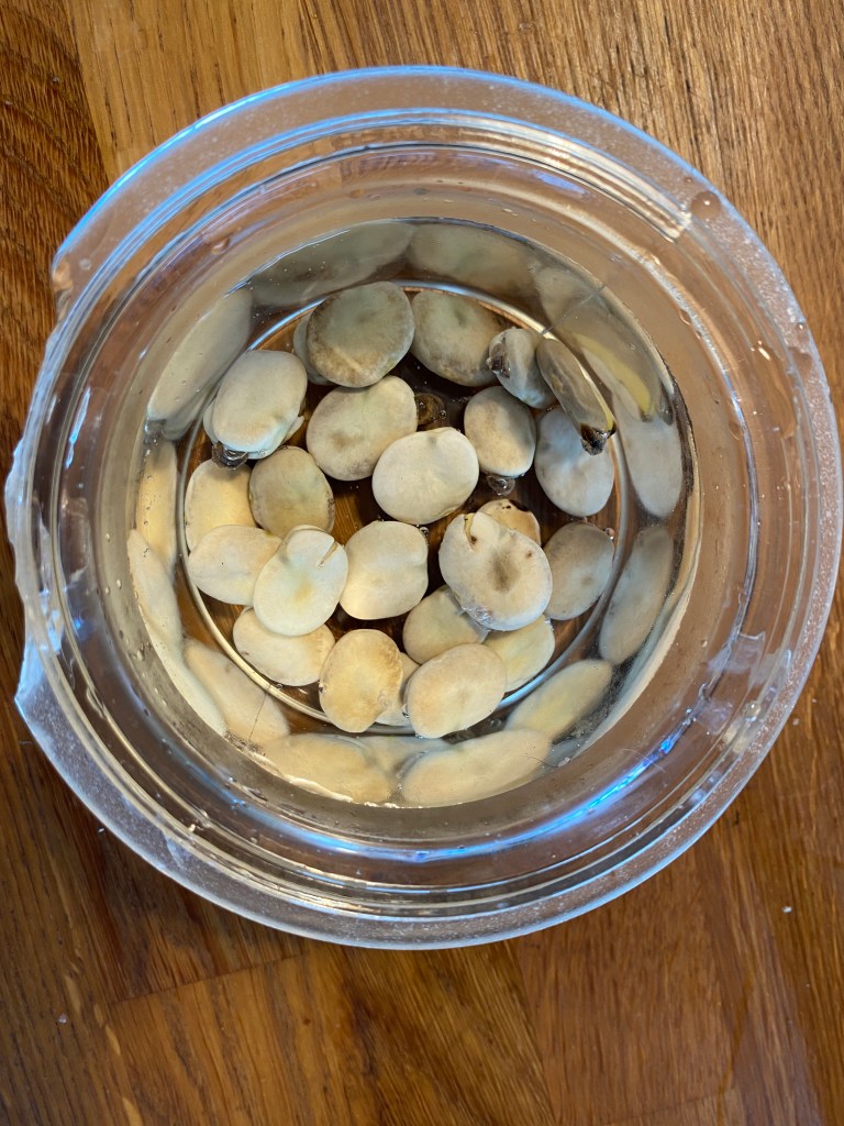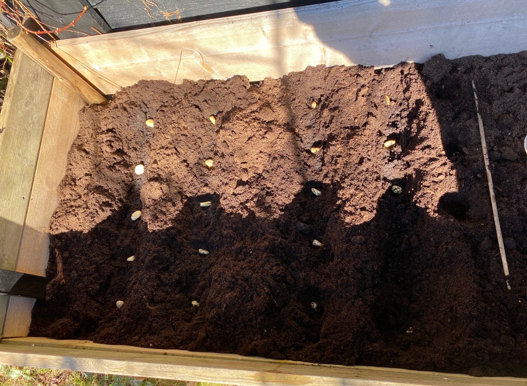 Och så har jag satt bondbönor, från egen skörd, sparade från i höstas. Några fick torka på plantan. De har jag nu blötlagt ett drygt dygn. Undrar om det funkar. Blir spännande att se.