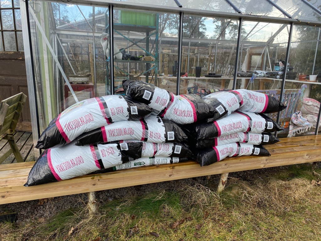 Han höll nog med nu när han såg helheten lite bättre, så vi bestämde tre fönster. Tillsammans!Sen åkte vi och köpte jord, åtta säckar à 80 liter. Så nu kan jag börja göra iordning alla friland på riktigt. Blandar upp den gamla jorden med ny, samt gödsel.