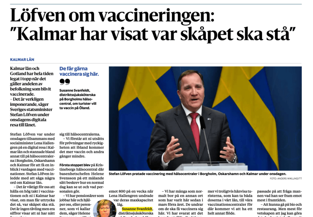 – Varför gå över ån efter vatten? Det är ju här allt händer. Detta enligt Sveriges statsminister som hälsade på hos oss igår och pratade om vaccineringen. Kalmar län ligger nämligen i topp när det gäller andelen av befolkning som blivit vaccinerade.