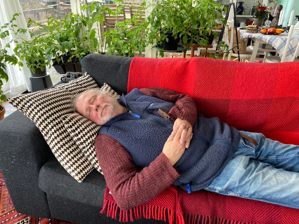 Hon: Han har maniskt spikat panel på Chateau Margareta sedan typ 9.30 imorse. Och mellan 7.30 och 9.00 fick han en liten lektion i hur han skulle göra av Tomek. En halvtimme ledigt för frukost, men ingen paus för lunch. Och nu somnade han med arbetskläderna på och nallen under armen, före drinken…