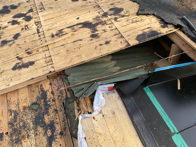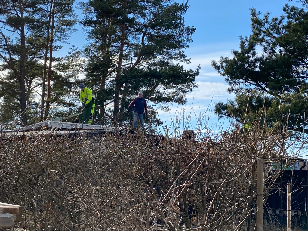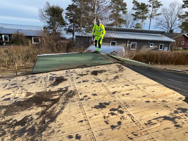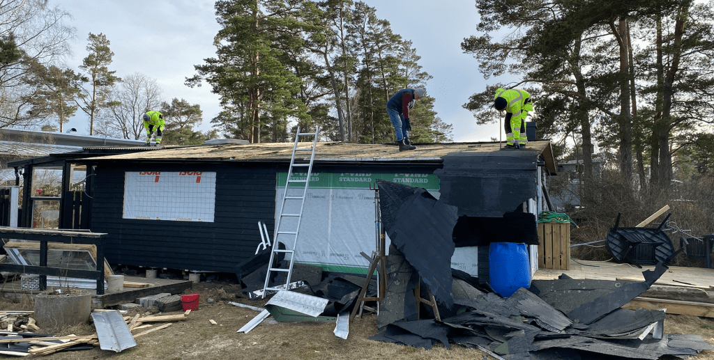 Han: Inte mycket att säga, idag började vi riva taket för att tilläggsisolera och lägga på plåt. Frågor på Det?