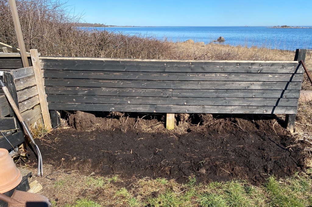 Var i alla fall ute ett par timmar på förmiddagen, i t-shirt… Först frukost i solen, och sen plantering av diverse blommor och ärtor nere vid ”solaltanen”. Perfekt med komposten precis bakom planket. Han eldade, manlig favoritsyssla.