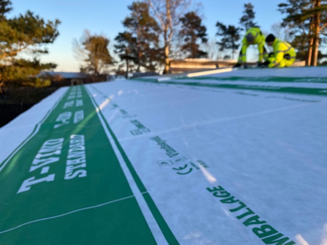 Han: I soluppgång firar vi min äldsta kompis CA Carlson genom att visa upp det nya taket som när solen gick ner igår kväll fått nya reglar, ny isolering och sedan förpackats i vindtyg i Hammarbys färger.