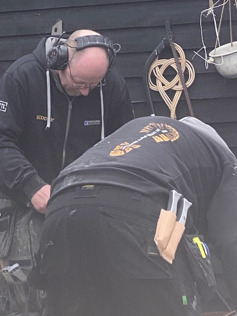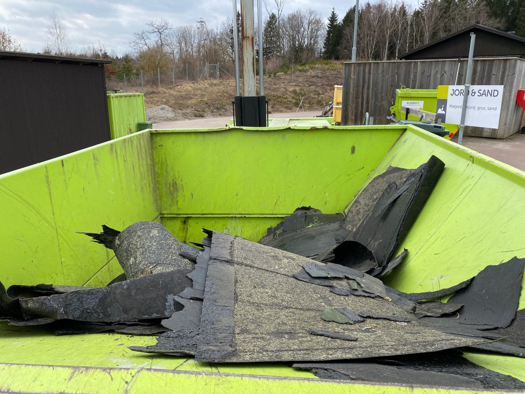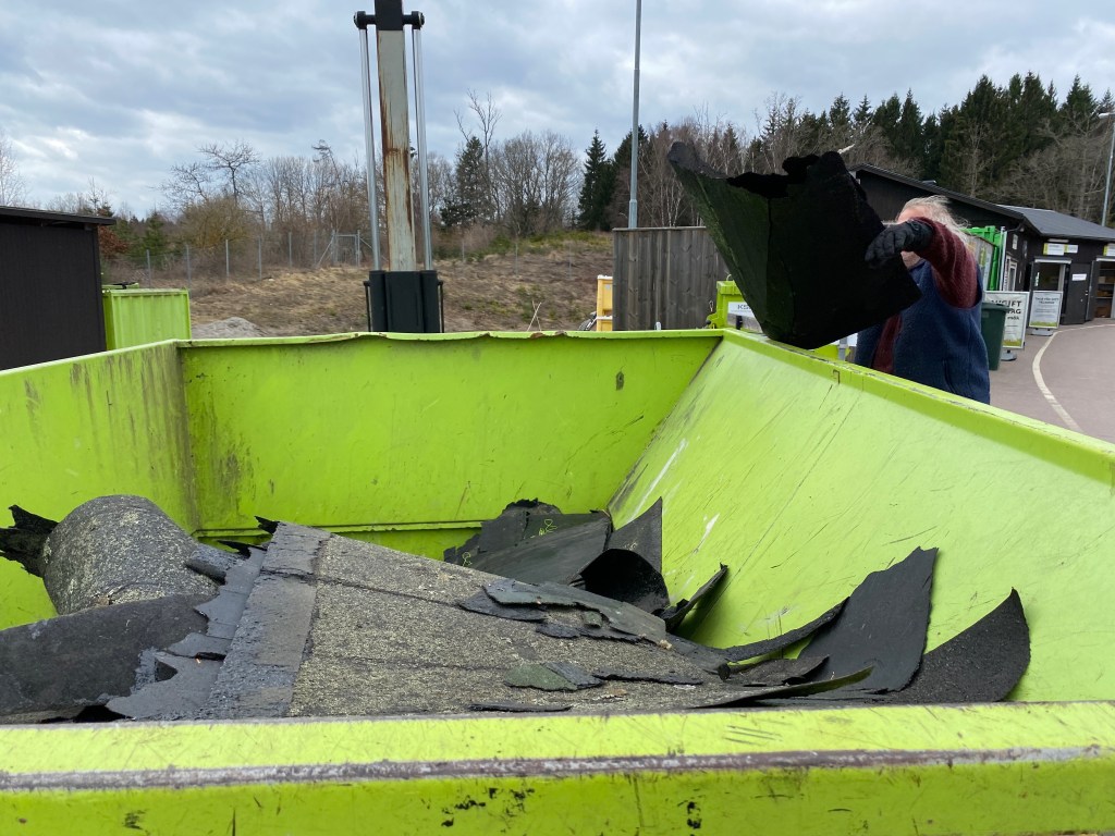 Hon: och när vi var på väg till soptippen med all tjärpapp som legat på taket ringde CA och meddelade glatt att han hade läst inlägget. Lika glada vara inte vi efter att ha lastat i och ur typ ett ton äcklig och farligt dammig ”asfalt”. Hela ansiktet sotigt och jeansen svarta som sot. Åkte rakt i maskinen på 60gr. Borde väl slängt i mig själv också…